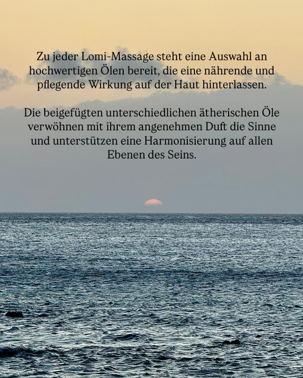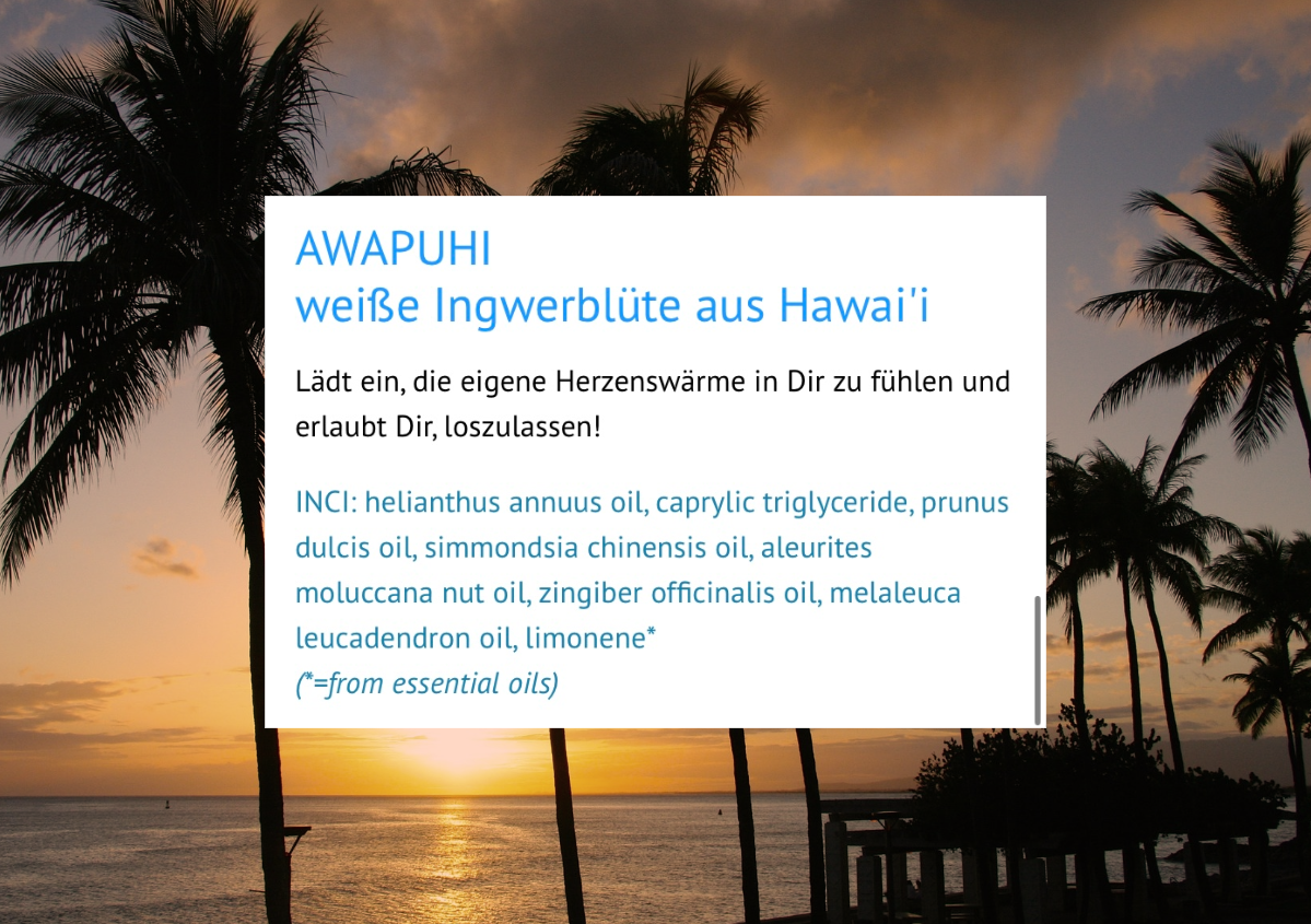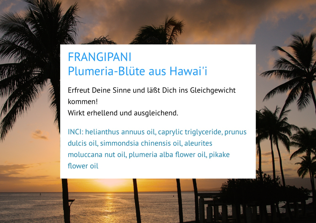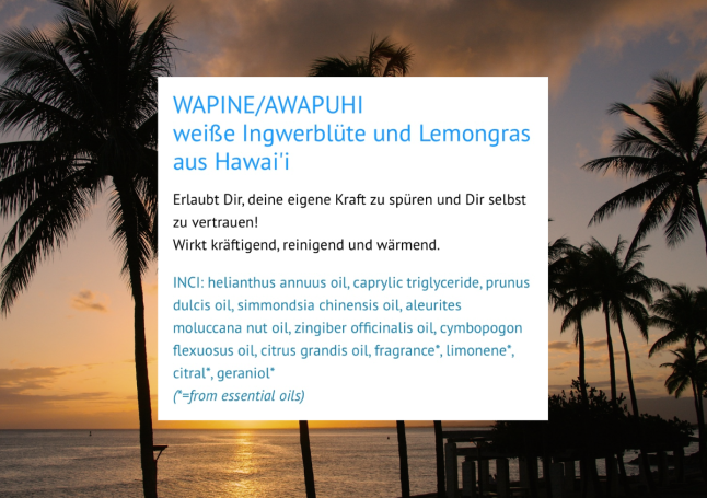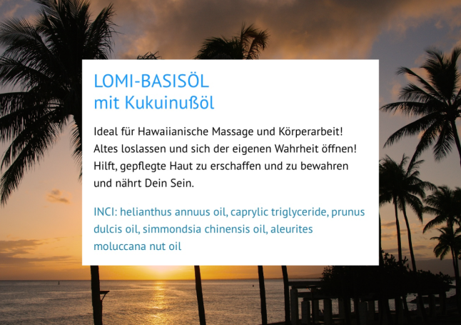 Das Öl unterstützt die hawaiianische Massagetechnik optimal, erleichtert sanfte Übergänge und fördert Ruhe, Ausgleich und Wohlbefinden auf körperlicher wie auch energetischer Ebene.
